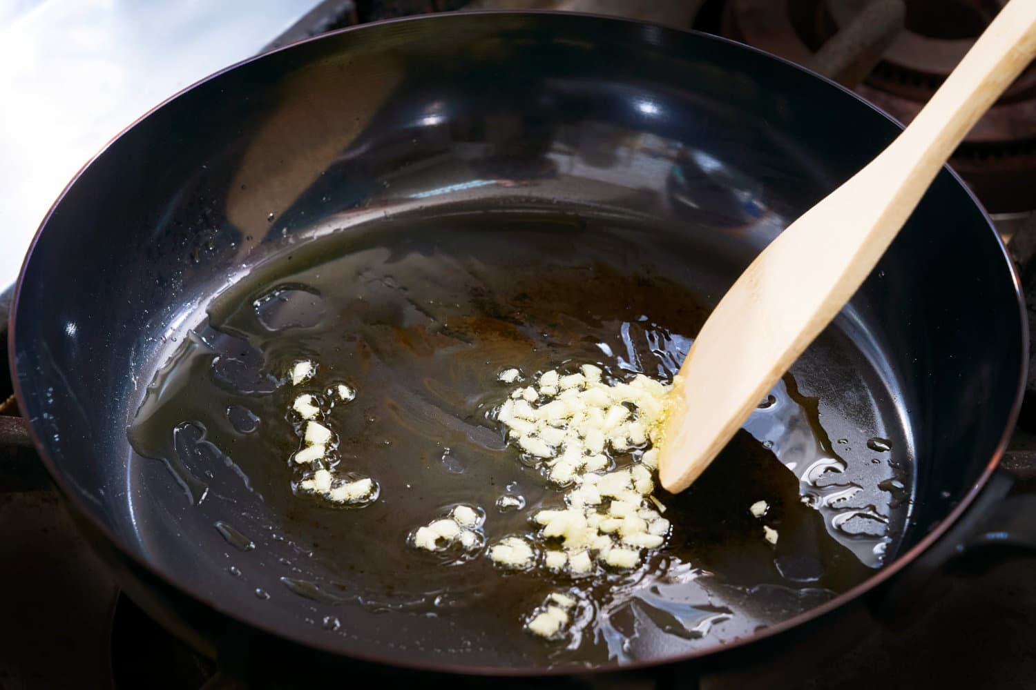 ① フライパンにオリーブオイルをひき、ニンニクを香りが出るまで炒める。