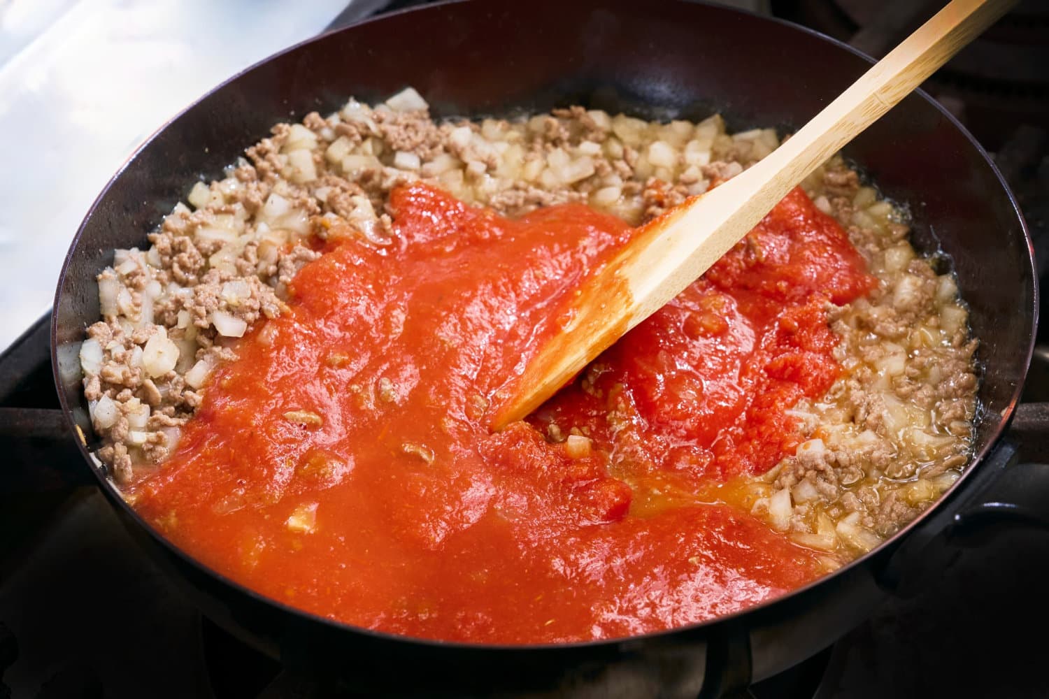 ③ タマネギを加え透き通るまで炒めてから、トマト缶を入れる。